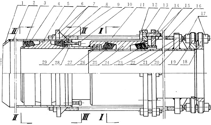 1、雙向套筒補(bǔ)償器,由左端套管2、左端芯管5、右端套管25、右端芯管23、左端內(nèi)密封圈4、左端外密封圈8、右端內(nèi)密封圈26、右端外密封圈24及連接緊固件構(gòu)成。 其特征在于:左端套管2的內(nèi)圓和左端芯管5的外壁凸起的兩側(cè)之間各有一個(gè)圓環(huán)狀楔錐形空間,右端套管25的內(nèi)部凸起的兩側(cè)和右端芯管23的外圓之間也各有一個(gè)圓環(huán)狀楔錐形空間,其各自的圓環(huán)狀楔錐形空間內(nèi),分別裝有于其相匹配的圓環(huán)狀楔錐形的左端內(nèi)密封圈4、左端外密封圈8、右端內(nèi)密封圈26、右端外密封圈24。